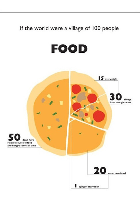 15 would be overweight. 30 would always have enough to eat. 50 wouldn’t have a reliable source of food. 20 would be undernourished. One would be dying of starvation.