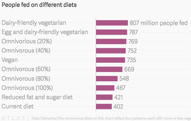 The average US consumer today requires more than 2.5 acres (over two football fields) of land each year to sustain his or her current diet. That number decreases dramatically as you reduce meat consumption and add in more vegetables. Three of the vegetarian diets examined in the study would use less than 0.5 acres of land per person each year, freeing up more land to feed more people.